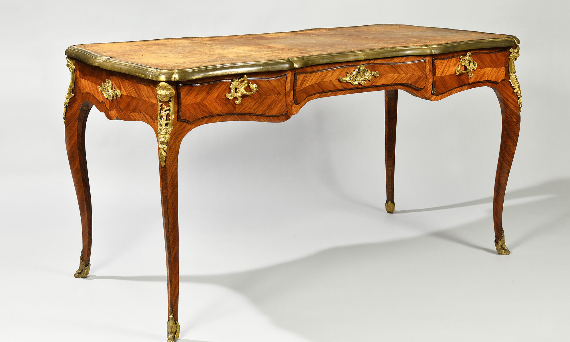 Marqueterie de bois de violette. Ornementation de bronze ciselé et doré à décor rocaille et de fleurs aux chutes, sabots et entrées de serrure. L’ensemble est mouvementé sur les quatre faces. Il ouvre par en façade par trois tiroirs et comporte trois tiroirs simulés à l’arrière. Il repose enfin sur quatre pieds galbés à pans coupés. Plateau chantourné ceinturé d’une large lingotière et tendu de cuir gaufré fauve.