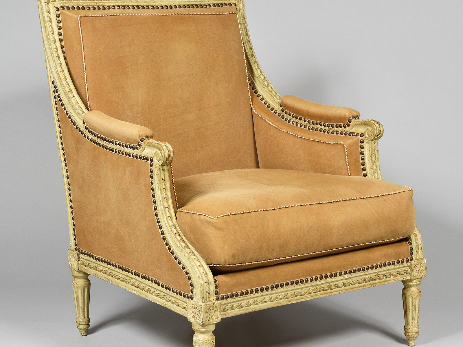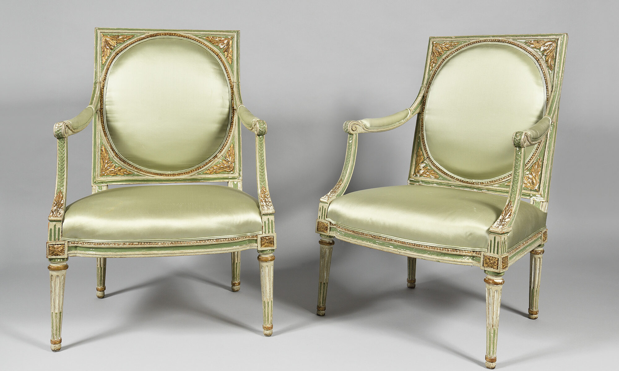 En bois sculpté et laqué gris rechampi vert aux rehauts de dorure. Dossiers carrés à décor de feuilles d’acanthe dans les écoinçons et frises de perles bordant un médaillon central. Les accotoirs à manchette et les montants en console sinversées à frises de piastres et feuillages. Ceinture cintrée avec dés de raccordement à fleurettes. Pieds fuselés à cannelures rudentées.