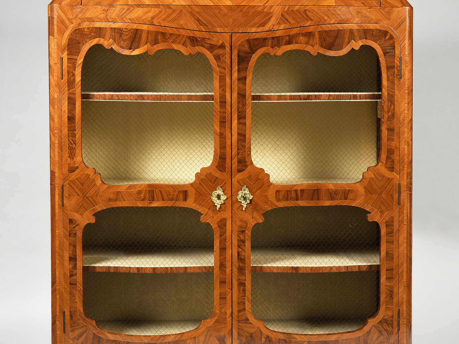 Façade légèrement mouvementée et ouvrant par deux portes à deux réserves chantournées ornées de grillages.