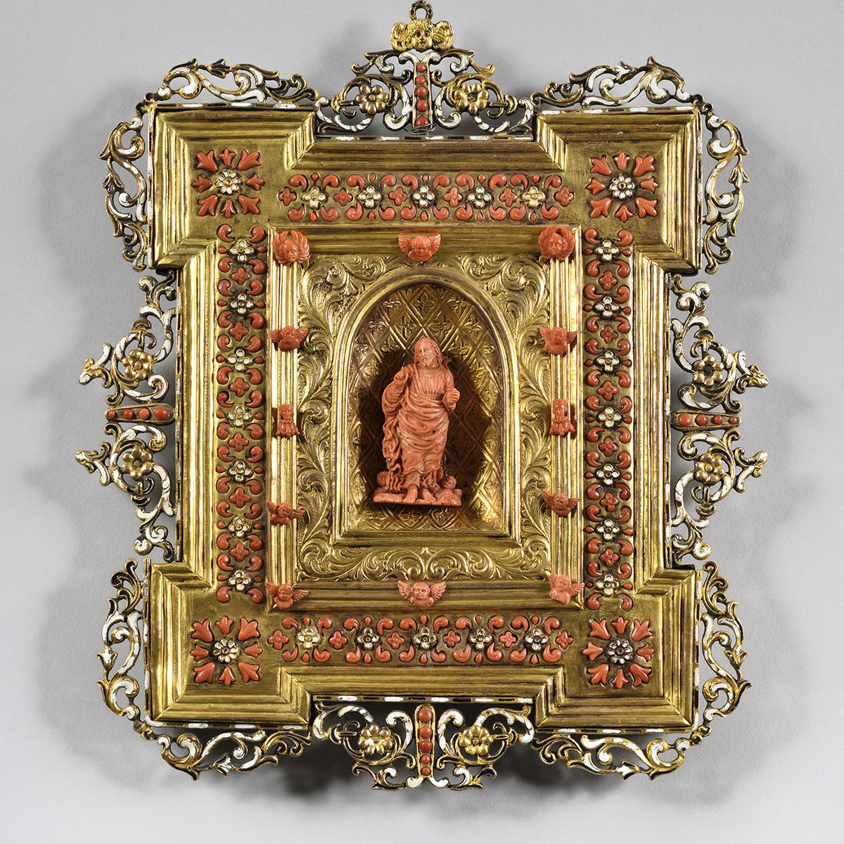 Ce type de marqueterie apparaît dès les années 1670 sur plusieurs types de meubles à la mode à cette époque. Il s’agit notamment de coffres, cabinets et bureau dits Mazarin, notamment réalisés par l’ébéniste Pierre Gole. Un petit groupe de commodes reprend ce décor dès l’invention de la forme même de la commode, à la toute fin du XVIIe siècle, certaines ont été assez récemment attribuées à Renaud Gaudron, ébéniste travaillant pour le garde-meuble de la Couronne. Une commode très similaire par son décor et ses bronzes attribuée à Gaudron est aujourd’hui conservée au musée des châteaux de Versailles et de Trianon, dépôt du Louvre, inv. 4655, cf: Calin Demetrescu, Les ébénistes de la Couronne sous le Règne de Louis XIV, La bibliothèque des Arts, Lausanne, 2021, fig. 221, p. 207.