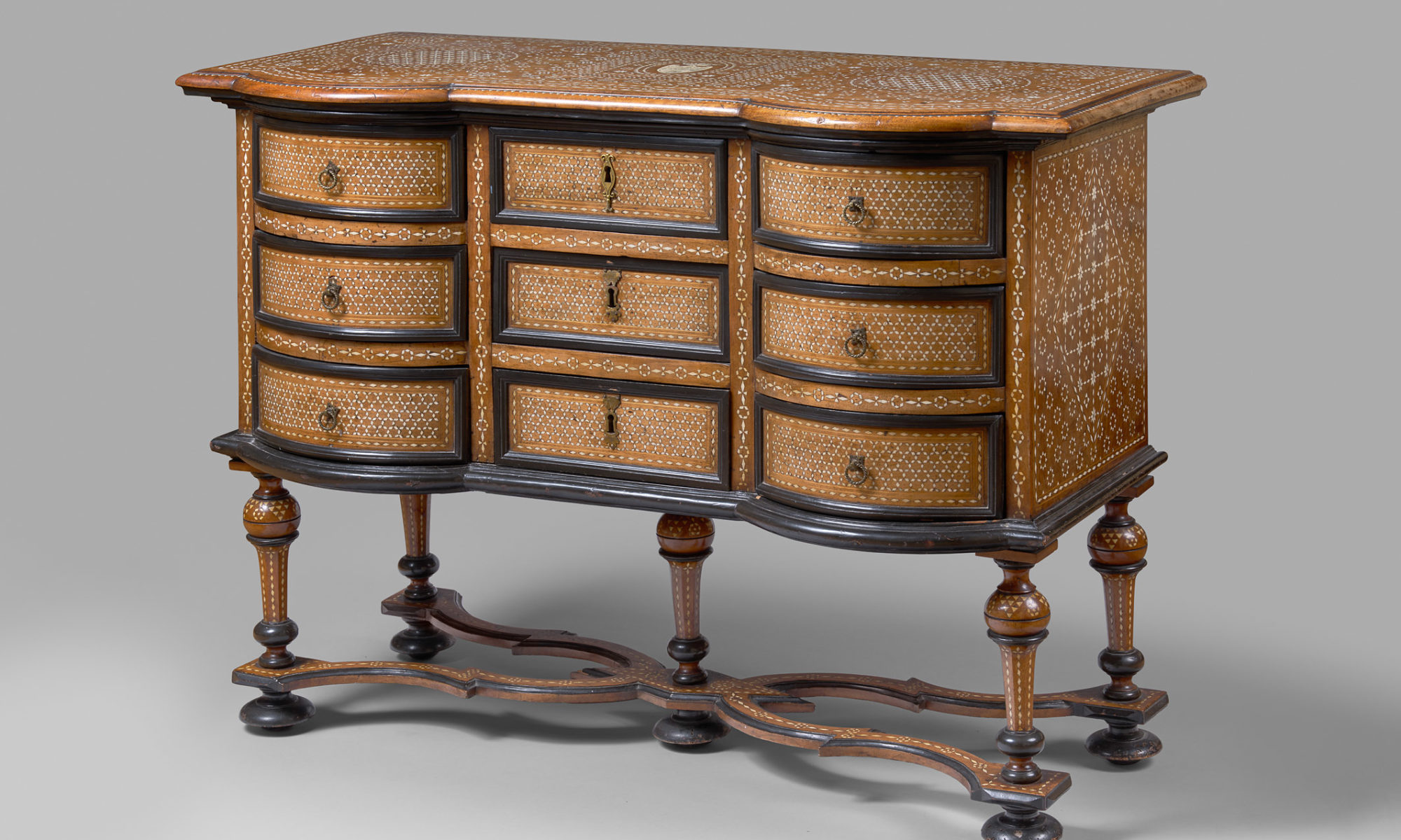 Bureau en noyer et bois noirci. Il présente un riche décor géométrique d’incrustations d’os gravé sur trois faces et le plateau. Il ouvre en façade à neuf tiroirs avec traverse, et repose sur cinq pieds fuselés à moulures reliés entre eux par une entretoise de forme X et des pieds de forme boulle aplatie.