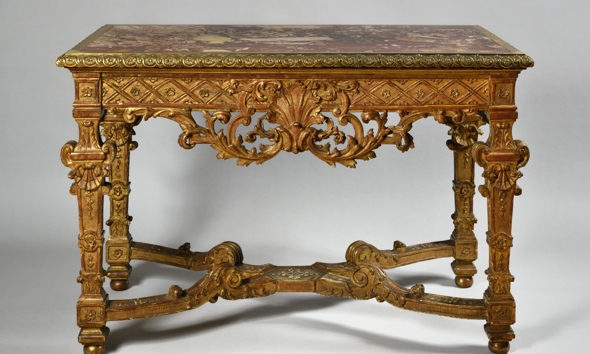 En bois mouluré, sculpté et doré, le dessus de brèche rouge à large lingotière ornée d’une frise d’oves et de fleurs ; la ceinture à fond quadrillé et à motif de fleurs présente une large feuille d’acanthe centrale flanquée de volutes feuillagées ; reposant sur quatre pieds en gaine, réunis par une entretoise en X à motif de feuilles et fleurs.