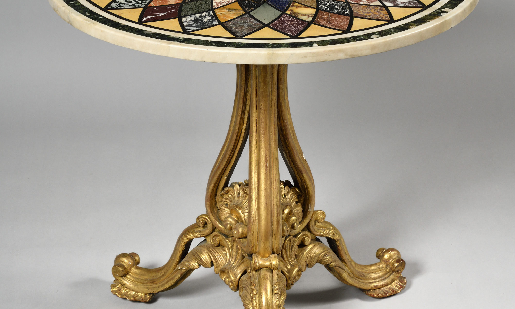Piètement en bois doré finement sculpté, supportant un plateau circulaire à décor de marqueterie de spécimens de marbres encerclant une précieuse micromosaïque.