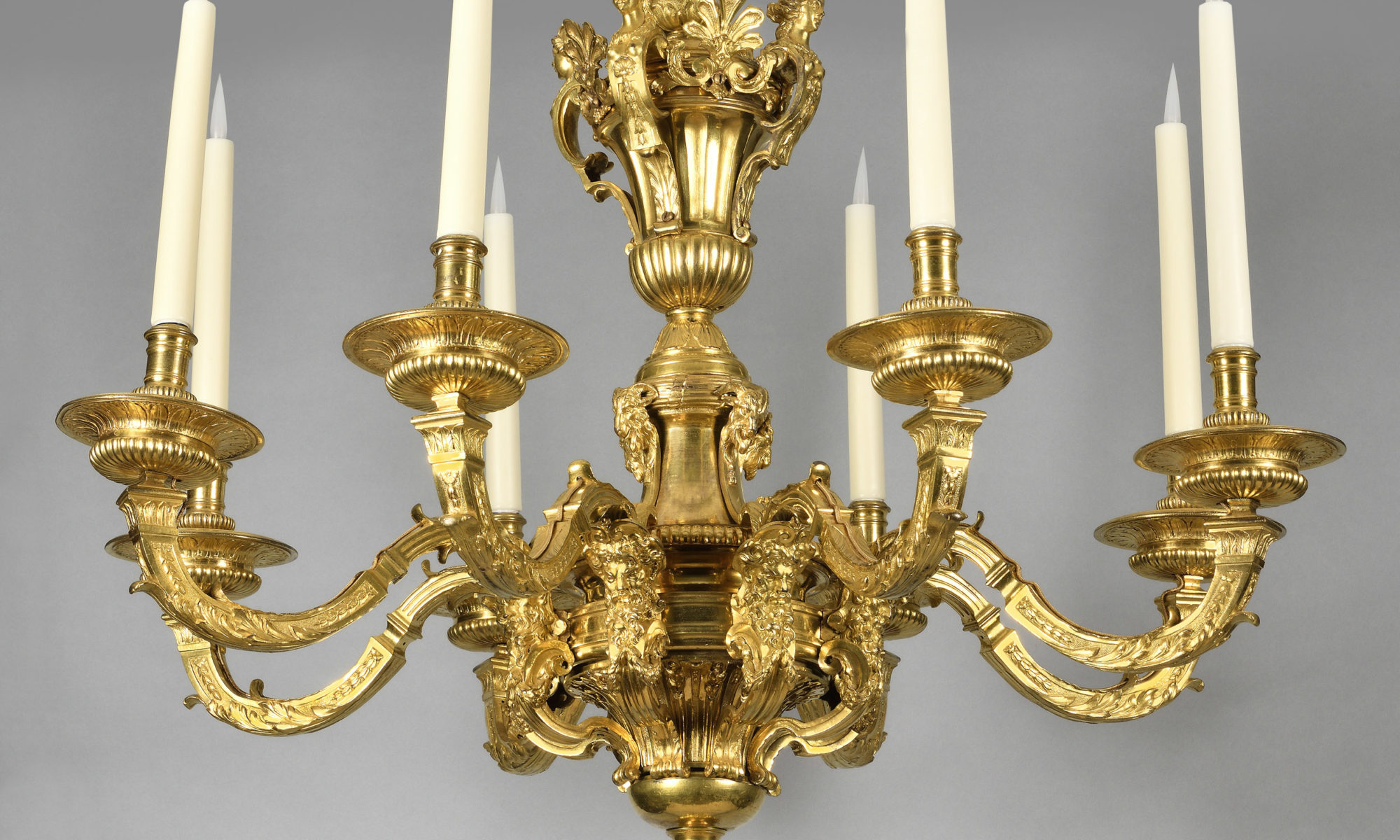 Rare lustre Louis XIV en bronze ciselé doré, dans sa dorure d’origine, les bras de lumière à section carrée présentant chacun à la base une tête d’homme barbu. Le fût à décor de têtes de bélier et de têtes de femme, le tout agrémenté d’ornements feuillagés.