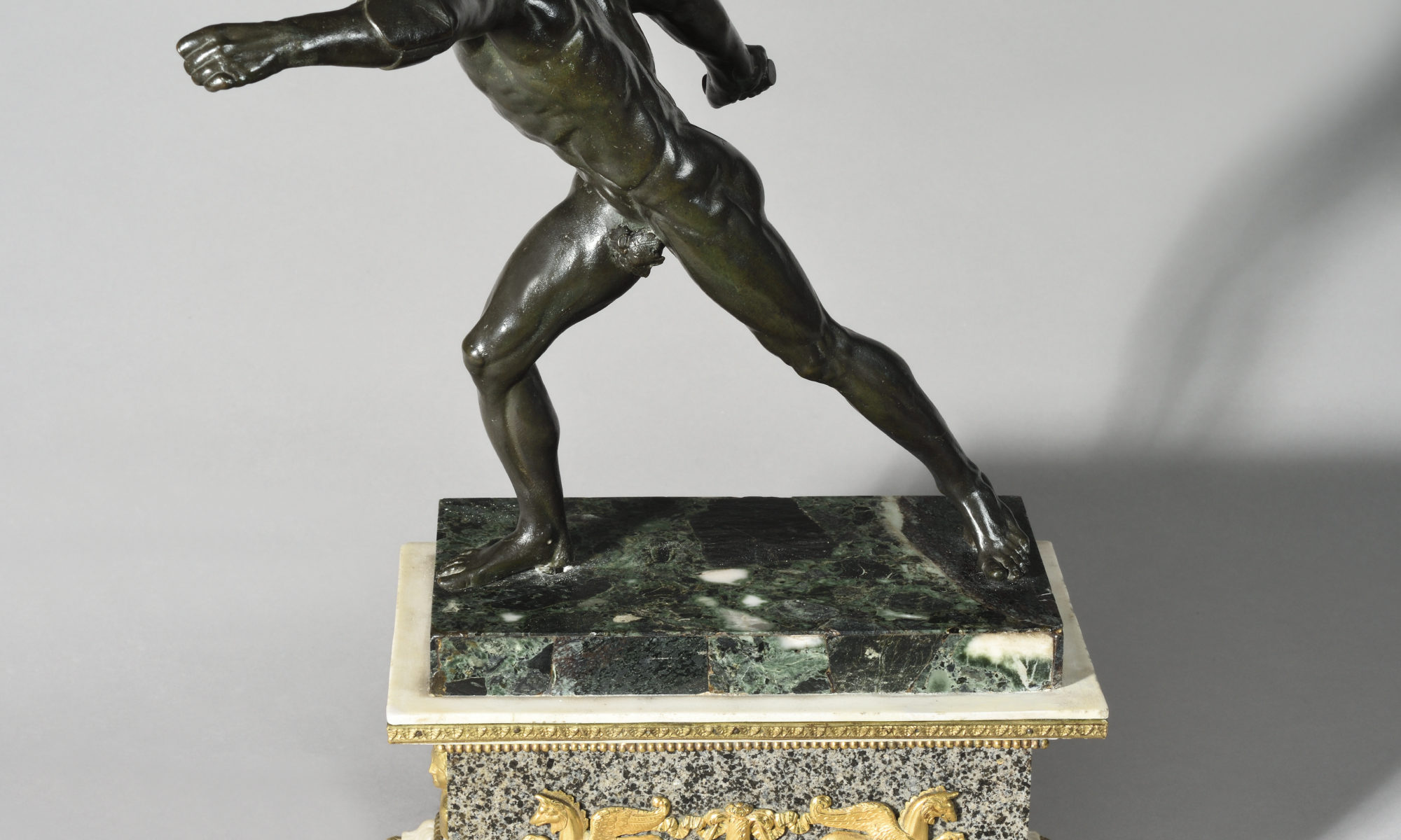 Dating from the Hellenistic period, this sculpture was unearthed during excavations carried out in Antium, Italy. It takes its name from the famous collection of Cardinal Borghese, and will be one of the works subsequently acquired by Napoleon 1st, and kept in the Louvre museum. (INV No. MR 224). Like many sculptures from Ancient Greece, this Gladiator will be used by the great bronziers at the end of the 18th century to decorate the collections of scholars performing their Grand Tour, and it appears in Righetti's catalog from 1794.