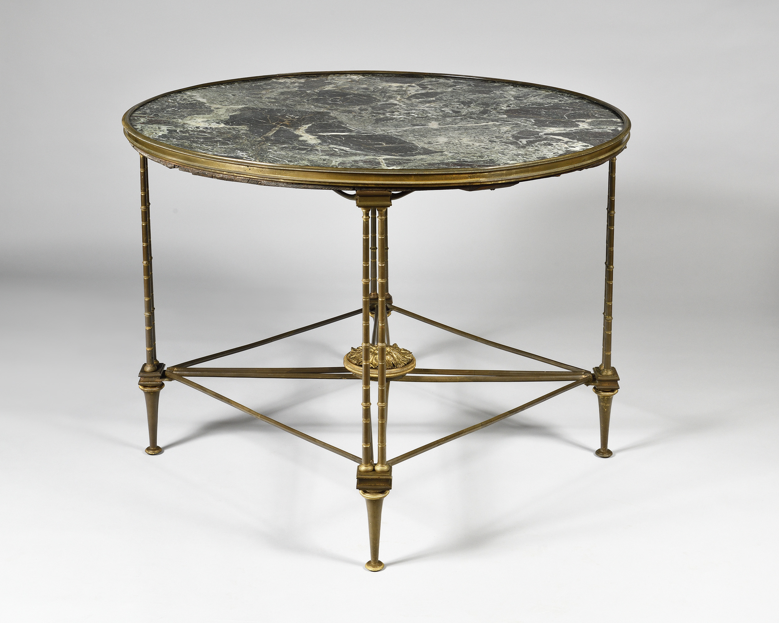 Large plateau de marbre vert ceint de bronze doré. L’ensemble supporté par des montant formés de quatre paires de colonnettes à l’imitation de tiges de bambou en bronze doré sur des pieds ronds fuselés et jointes par une entretoise en X jumelée à rosace centrale