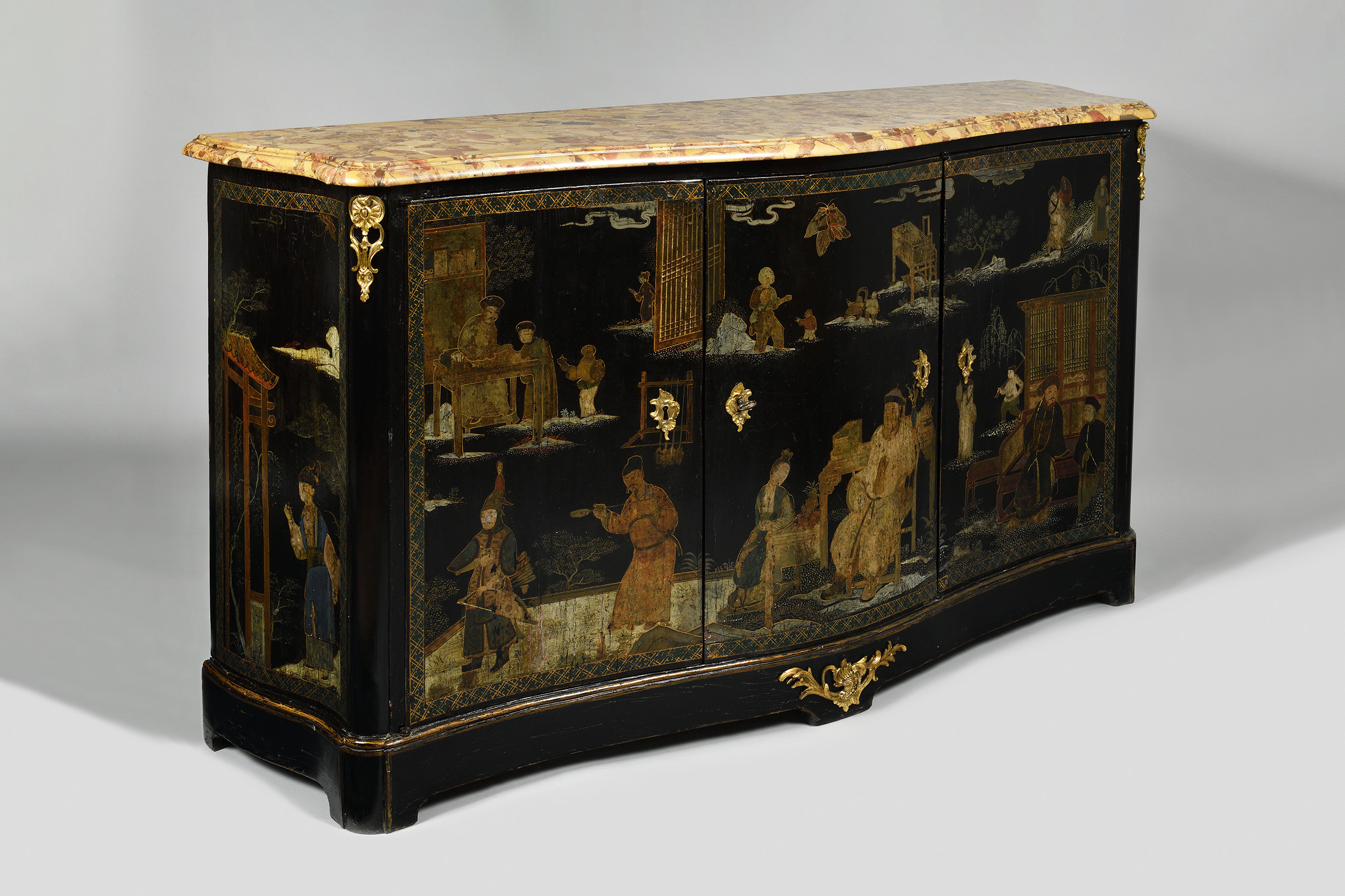 Bois laqué en vernis Martin à décor polychrome de scènes aux chinois sur fond noir. Bâti en résineux, chêne et noyer pour les vantaux. Façade légèrement mouvementée ouvrant par trois vantaux. Ornementation rocaille en bronze doré. Dessus de marbre brèche d’Alep.