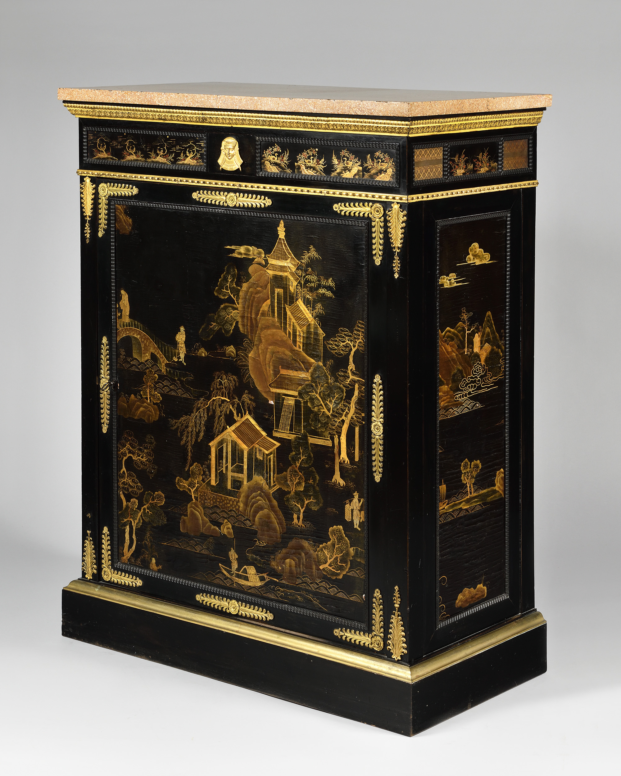 The central and side panels are decorated with various figures, pagodas, trees, boats and a bridge in rural and mountainous landscapes, surrounded by undulating mouldings. The marble top rests on a guilloché moulding with a pearl motif, topped by a cornice alternating acanthus and lotus leaves, above a long frieze drawer composed of two panels decorated with repeating motifs of exotic birds, flowers and trees. The frieze drawer, lined with cedar, has a central lock concealed by a bust of a pharaoh, above a moulding with a beaded and scroll border. A large door below, gilt bronze ornamentation composed of palmettes centred on a rosette, enclosing a walnut-lined interior with two adjustable shelves. The whole stands on a wide plinth.