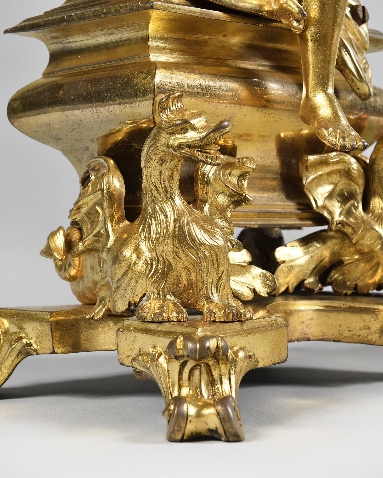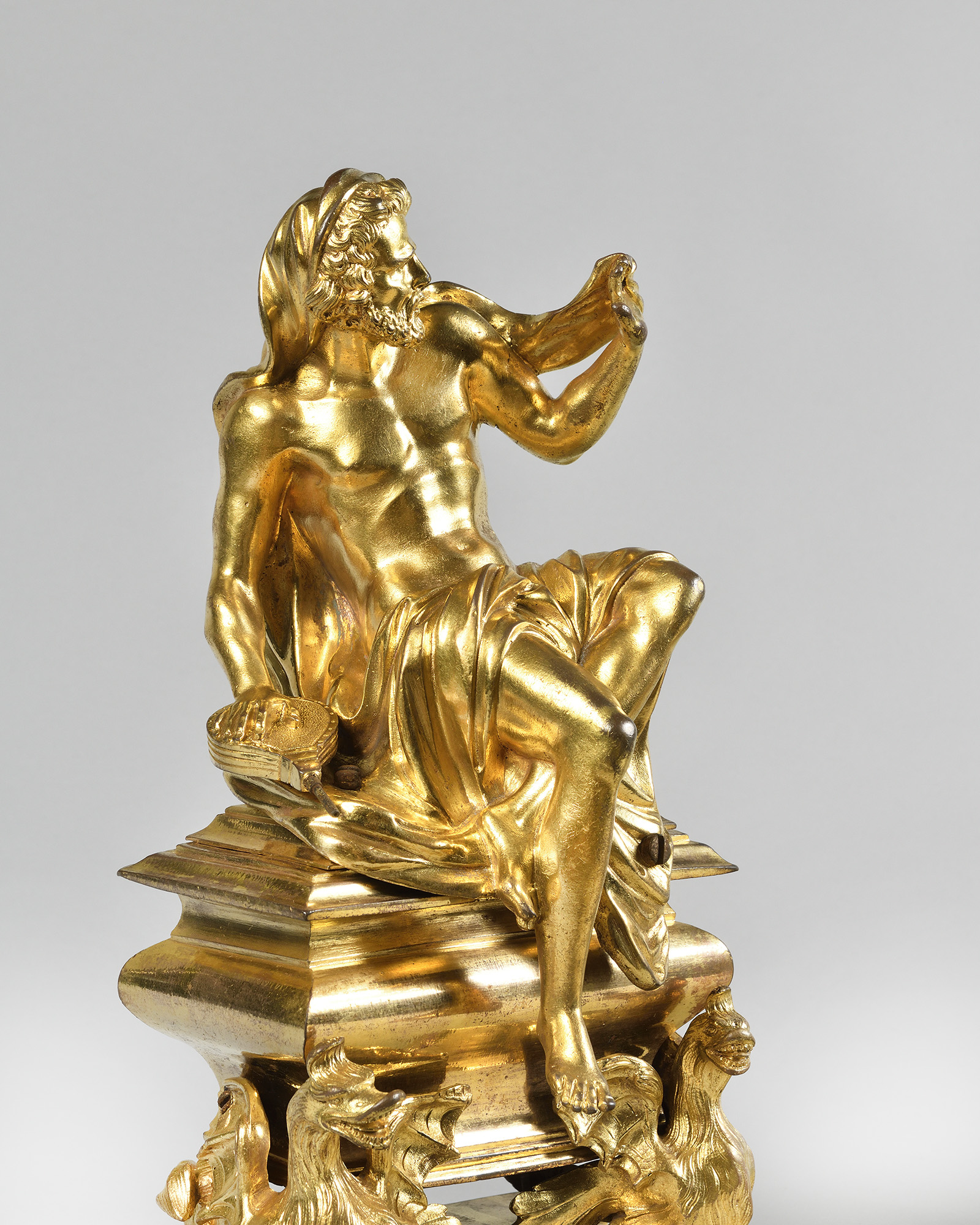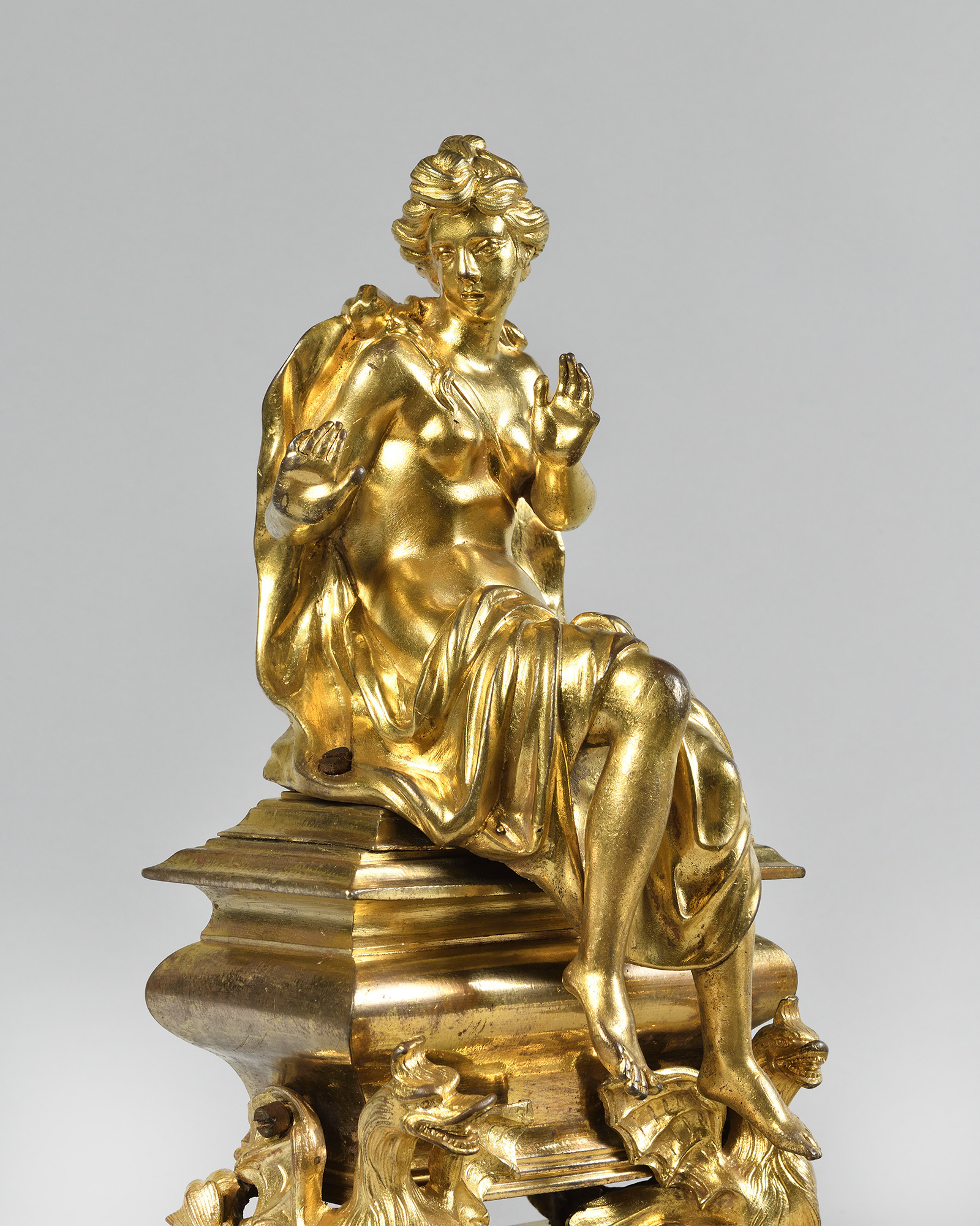 This beautiful pair of andirons can be compared to another pair decorated with the same figures, acquired around 1725 by Margrave Carl Wilhelm Friedrich for the Margrave's mirror cabinet at Ansbach Castle, or to an identical pair kept at the Museum of Fine Arts in Houston (No. 2004.137.1.2).