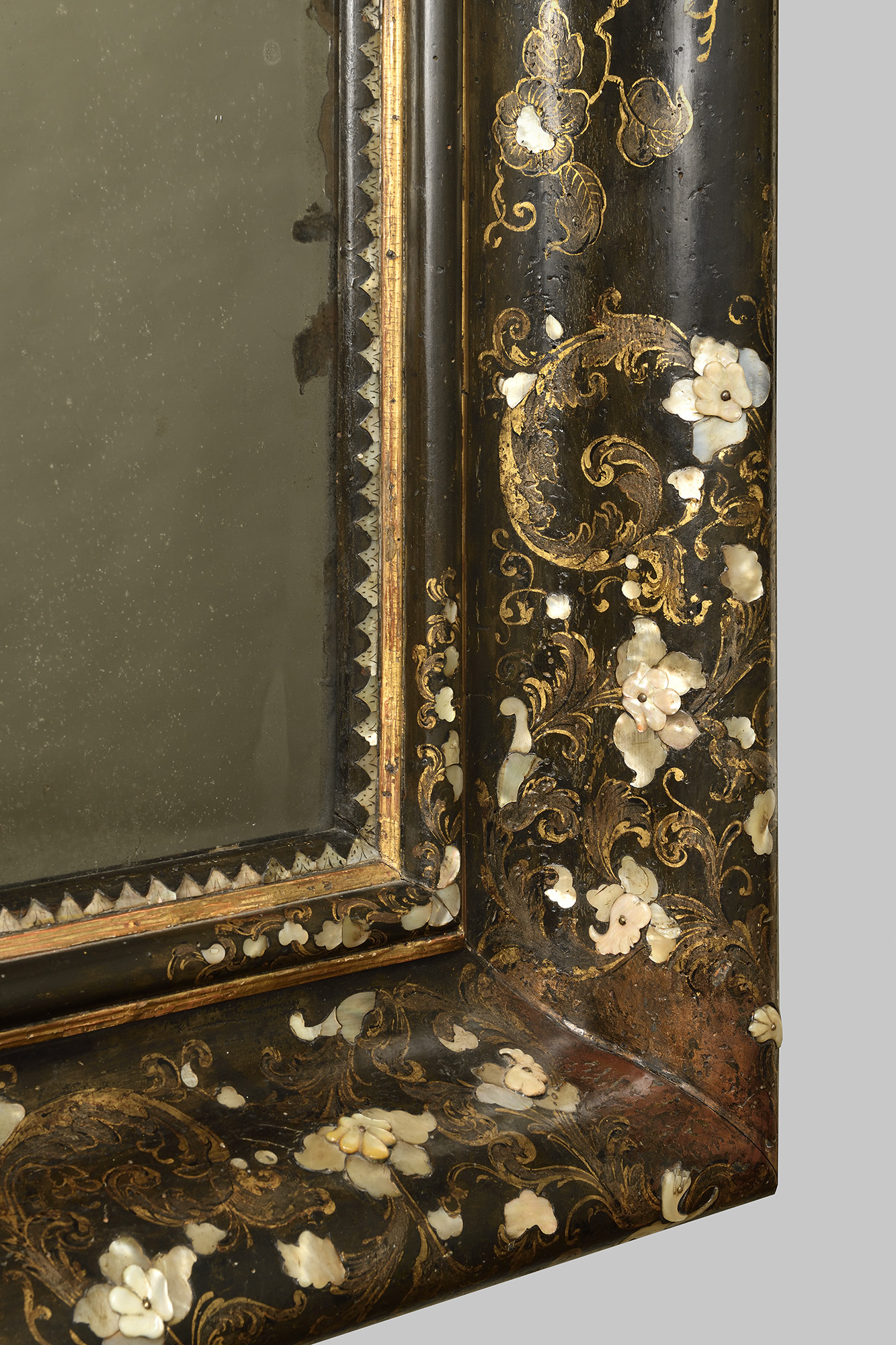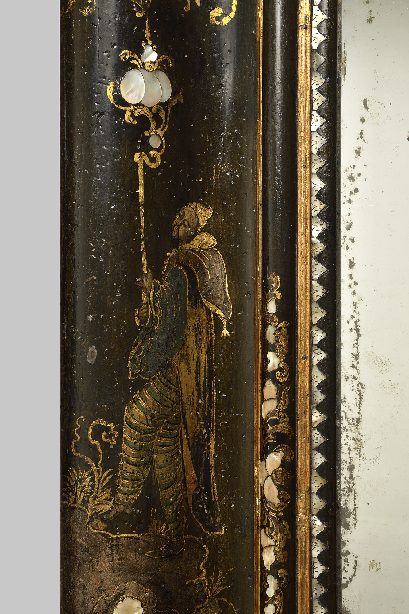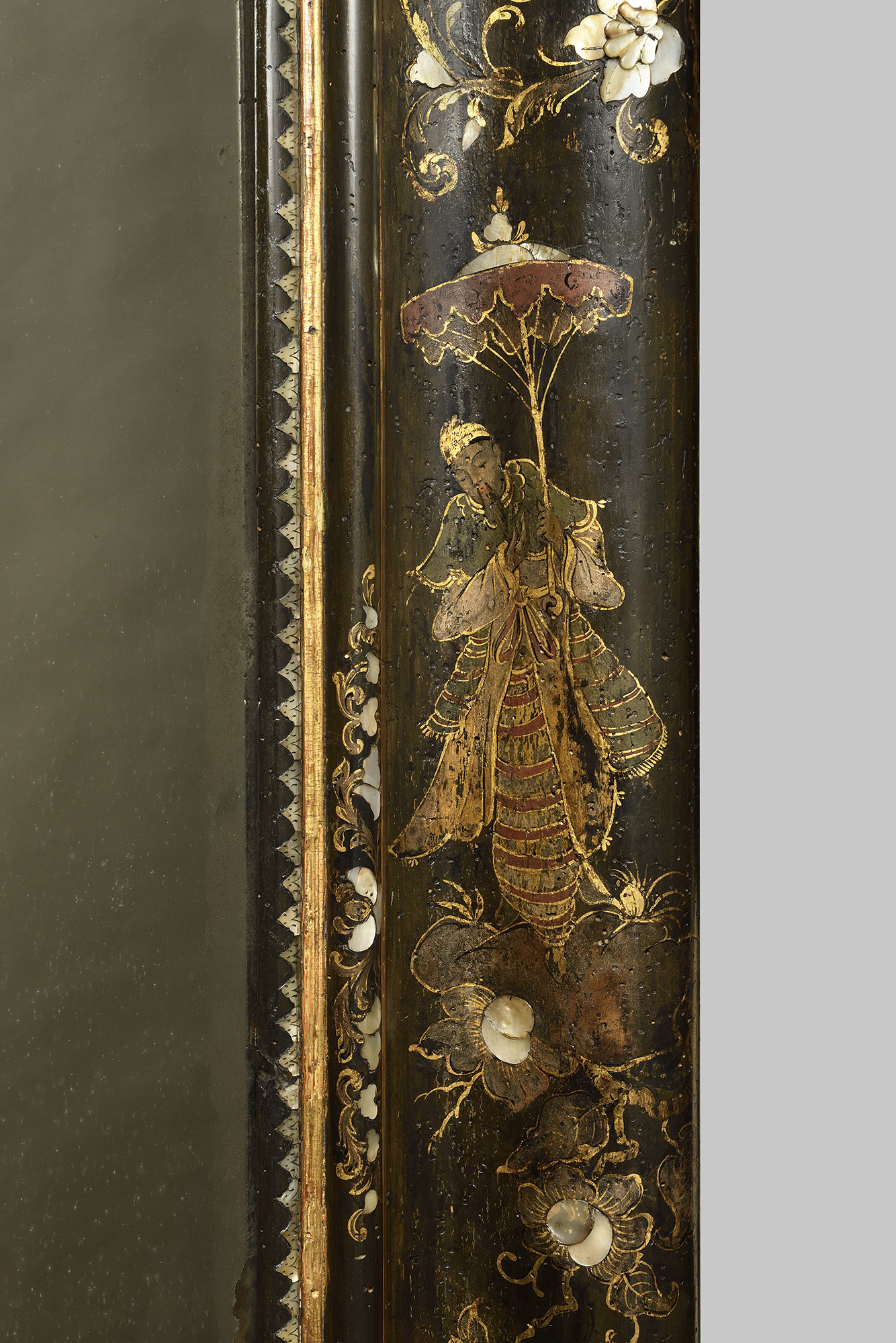Bois laqué à fond noir et à décor doré de chinois et de fleurs. Incrustations de nacre.