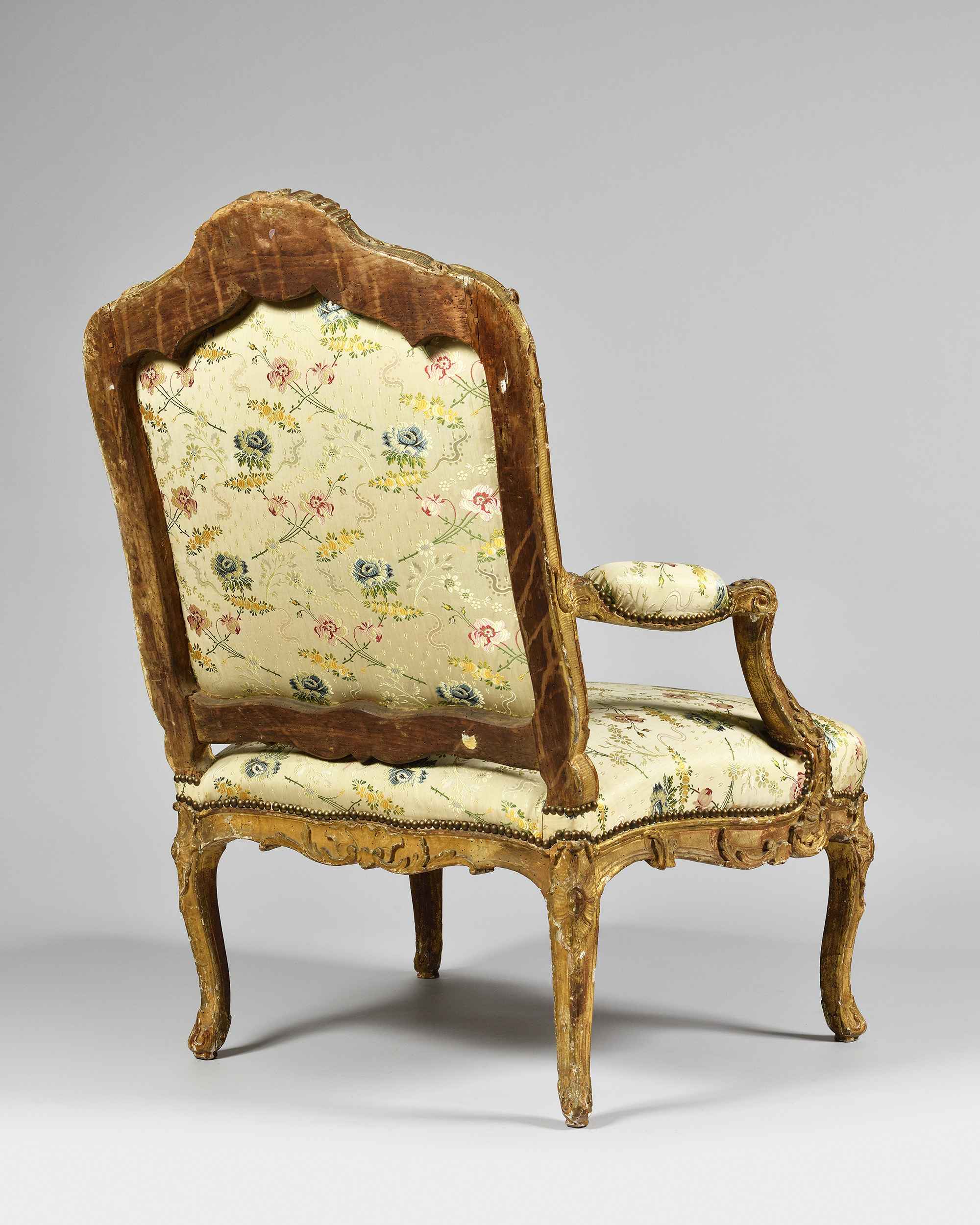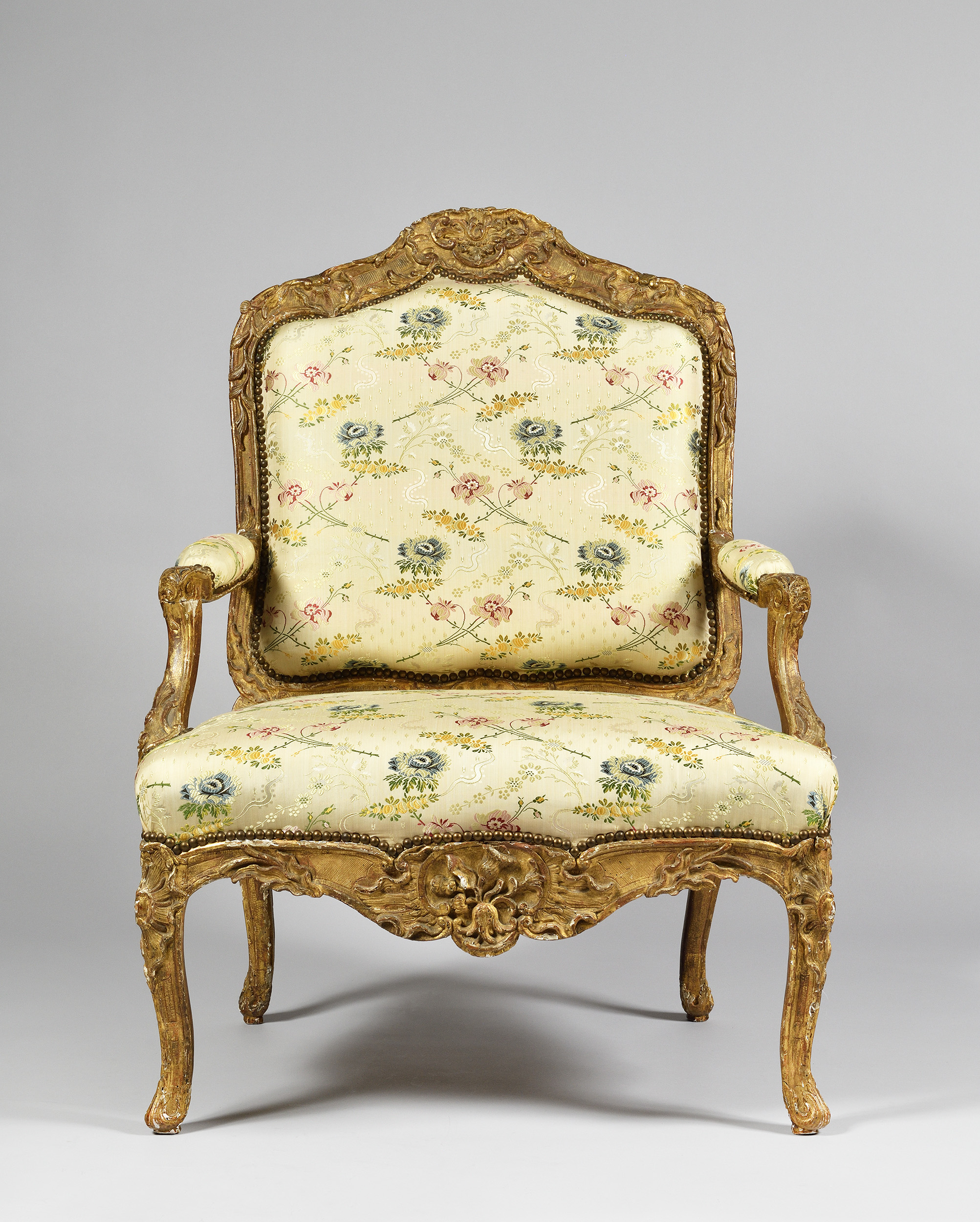 Dossier plat cintré. Sculpté de motifs rocailles, de grenades éclatées et larges fleurs. Accotoirs à manchettes. Pieds cambrés à motifs feuillagés. Garniture de soie fleurie moderne.